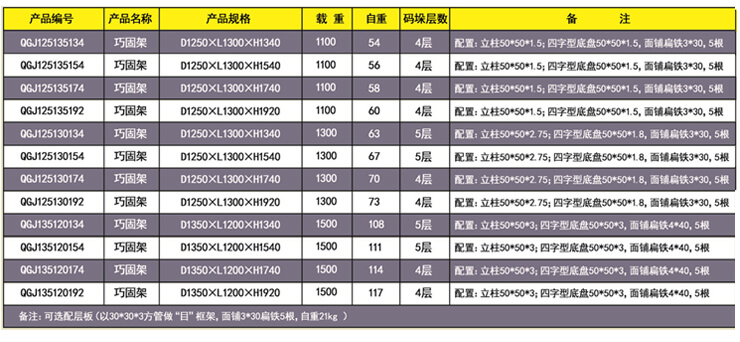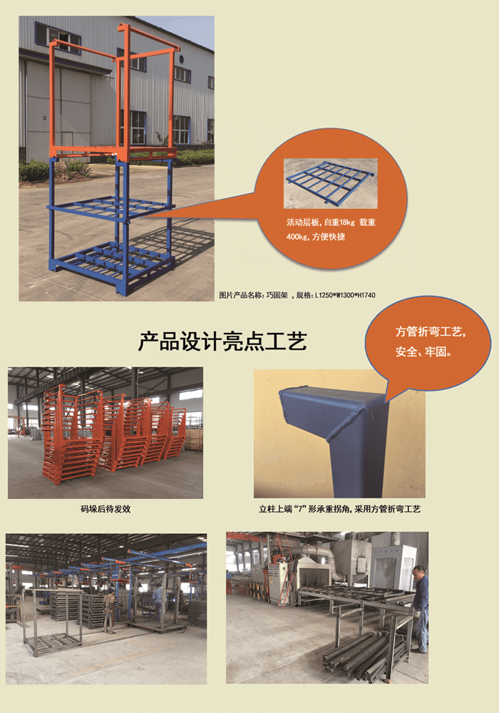 产品特点:底部码垛角铁成80°设计促使码垛的巧固架越压越紧。