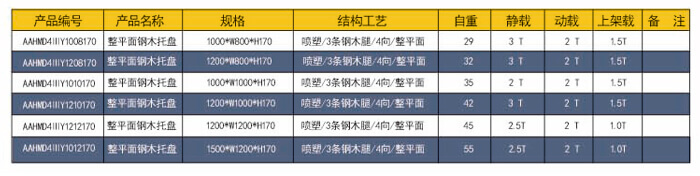 四向三腿——整平面钢木托盘 技术参数说明: 产品编号:AAHMD4ⅢY1512170 产品规格: 1500*1200*170 防锈工艺: 静电银粉沙纹喷塑 产品静载: 2000KG(均匀载重) 产品动载: 2000KG(均匀载重) 产品上架: 1500KG(均匀载重) 主要用途: 仓库、车间周转、高库物流及仓储