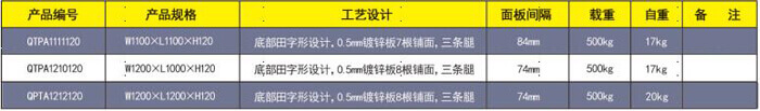 产品编号:QTPA1111120 产品规格:W1100×L1100×H120 托盘主孔:100mm 托盘侧孔:80 mm 产品自重:16 kg 产品静载:800kg 产品动载:600kg 上货架载:不建议 产品配置:采用宝钢镀锌板轧机成0.5*10*85 多筋骨面板10根,以间隔84mm 和6根板做腿+9个立撑组成。 产品用途:广泛用于酒水、食品、化工、电子 等大量物品仓储与周转。 产品缺陷:不宜上货架。