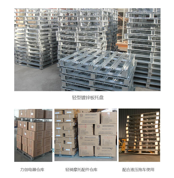 轻型A型镀锌板托盘 产品用途: 本产品采用上海宝钢大锌花0.5—1.0mm厚的镀锌板轧压变形,优点质量轻承重好,焊点处涂银粉油漆或植物桐油防止焊点生锈。应本产品热镀锌层面工艺,防锈能力非常强,广泛用于轻工业制造,如冷链、食品车间生产、酒水制造,电子制造仓储与周转。对比木板托盘免熏蒸,常作为随货底托,随产品一次性出口。提示:不建议上货架,如上货架,主材厚度1.2mm。